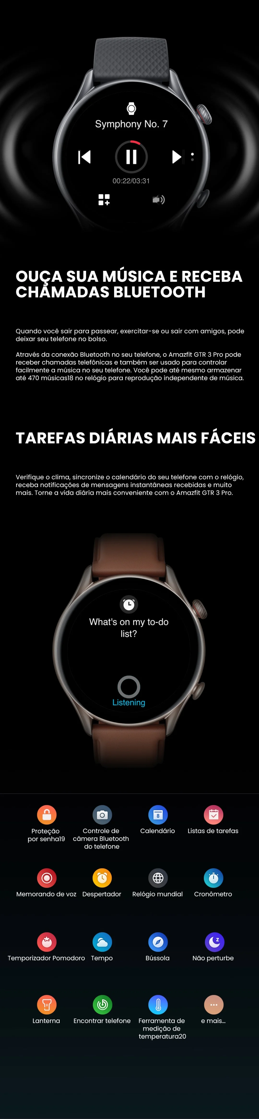 Funções: Pedómetro, rastreador de atividades físicas, calendário, bússola